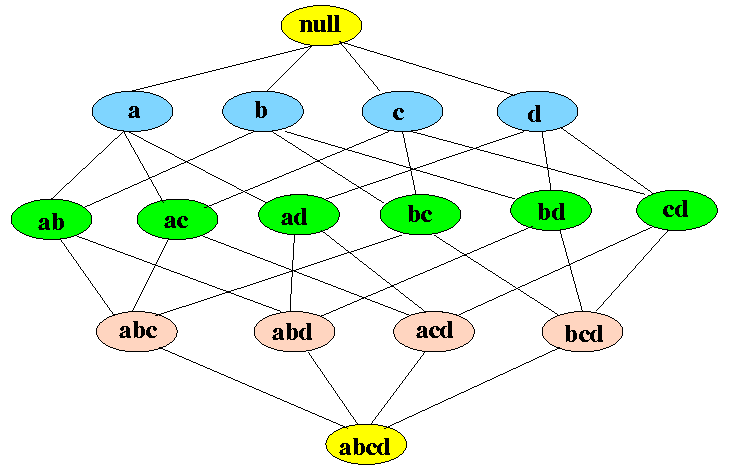 Los nodos coloreados indican si el conjunto cumple con el mínimo soporte (min_sup):